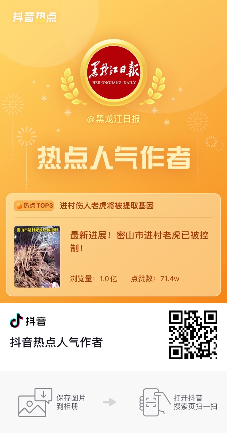 2021年4月23日,黑龍江省密山市白魚灣鎮(zhèn)臨湖村“驚現(xiàn)”一只成年野生東北虎......接下來,這只“進村虎”引發(fā)了全國媒體的關(guān)注,黑龍江日報報業(yè)集團旗下各媒體也積極跟蹤事態(tài)發(fā)展。其中,黑龍江日報抖音號推送的《最新進展!密山市進村老虎已被控制!》單條瀏覽量突破1個億,登上抖音熱點榜TOP3,并獲得抖音“熱點人氣作者”稱號。黑龍江日報和龍頭新聞抖音號分別推出了“直擊猛虎下山”專輯,截至記者發(fā)稿時,15條短視頻的總播放量已接近兩億。