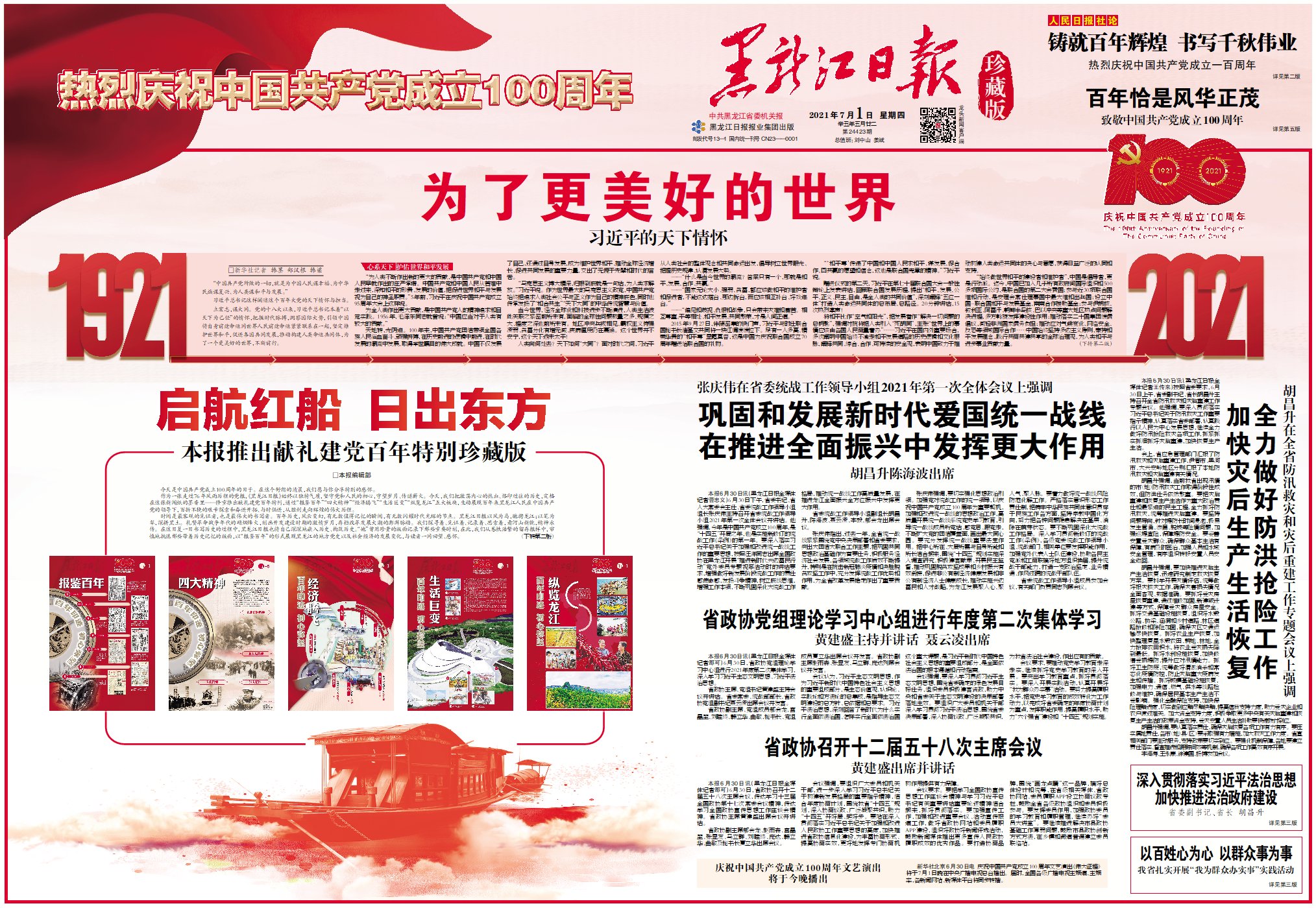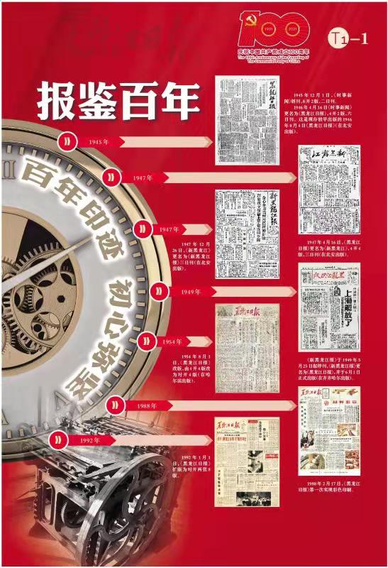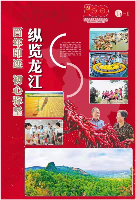 作為一張走過76年風(fēng)雨歷程的黨報,《黑龍江日報》始終以獨特氣質(zhì),堅守黨和人民的初心,守望歲月、傳遞薪火。今天,我們把激蕩內(nèi)心的熱血、烙印過往的歷史,定格在這張新聞紙的墨香里——隆重推出獻(xiàn)禮建黨百年特刊,通過“報鑒百年”“四大精神”“經(jīng)濟(jì)騰飛”“生活巨變”“縱覽龍江”五大板塊,生動展現(xiàn)百年來黑龍江人民在中國共產(chǎn)黨的領(lǐng)導(dǎo)下,百折不撓的艱辛探索和奮進(jìn)開拓、與時俱進(jìn),從勝利走向輝煌的偉大歷程。