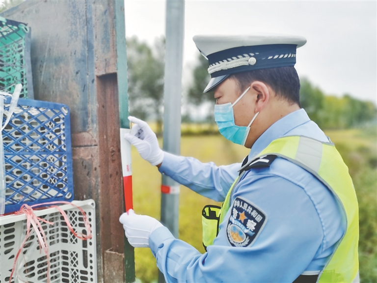 交警為農(nóng)用車輛粘貼反光條。