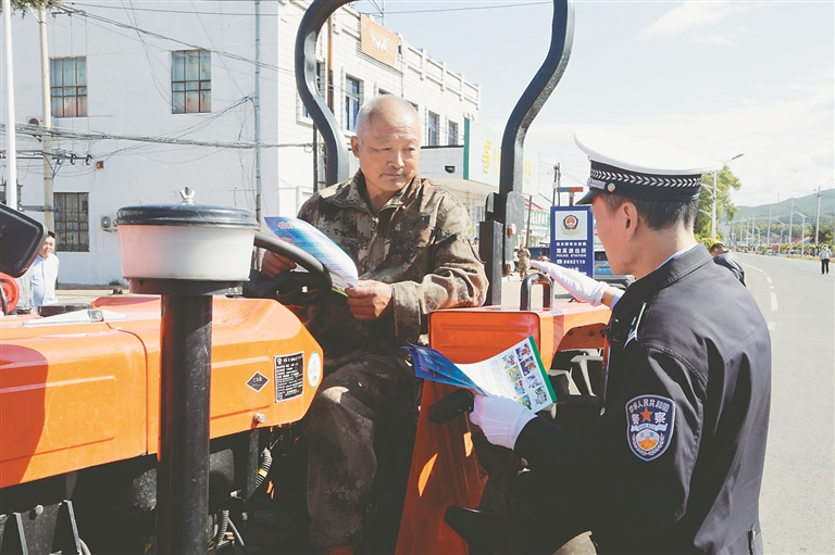 交警向農(nóng)機(jī)駕駛員講解道路安全常識。