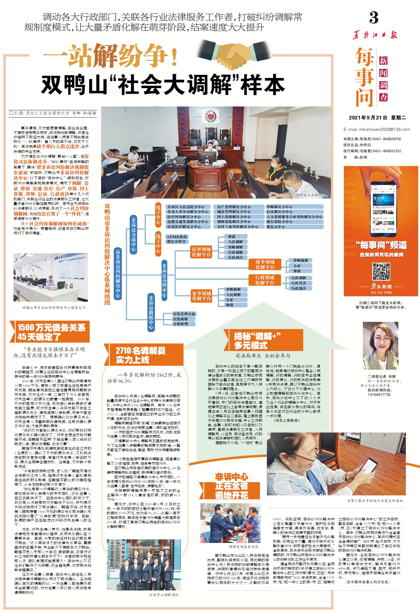 “要進一步完善社會矛盾多元化解機制,運用各方力量、通過多種方式化解矛盾糾紛,積極維護社會大局穩(wěn)定。”省委常委、政法委書記張安順在雙鴨山調(diào)研時,對雙鴨山市非訴訟糾紛解決中心的創(chuàng)新實踐工作給予肯定。