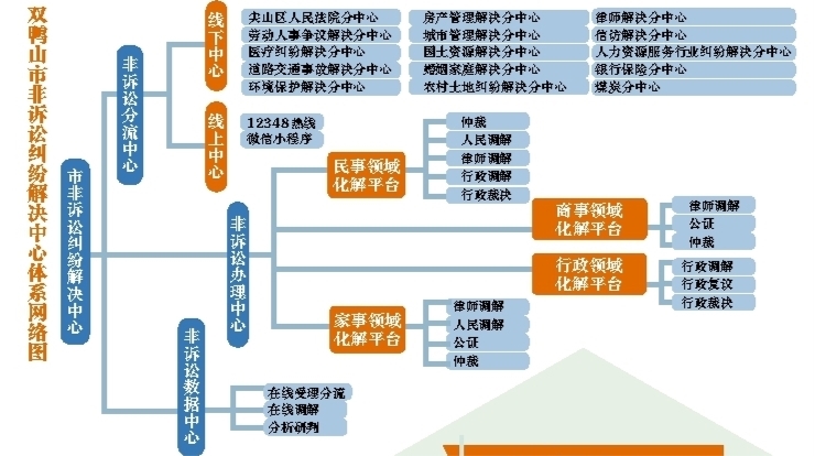 據(jù)苗曉文介紹,“一站式”是讓群眾只進一個門就能化糾紛。具體說,就是通過非訴中心整合人民調(diào)解、行政調(diào)解、行政性專業(yè)性調(diào)解、行政復(fù)議、行政裁決和仲裁等8類司法資源,再以雙鴨山非訴中心為核心,下設(shè)線下辦理中心、線上數(shù)據(jù)調(diào)解和非訴分流中心。其中,非訴分流中心又下設(shè)15個涉及各個行業(yè)的調(diào)解分中心,對于專業(yè)性強、存在部分爭議的案件,將其分流至對應(yīng)行業(yè)的分中心做進一步處理。
